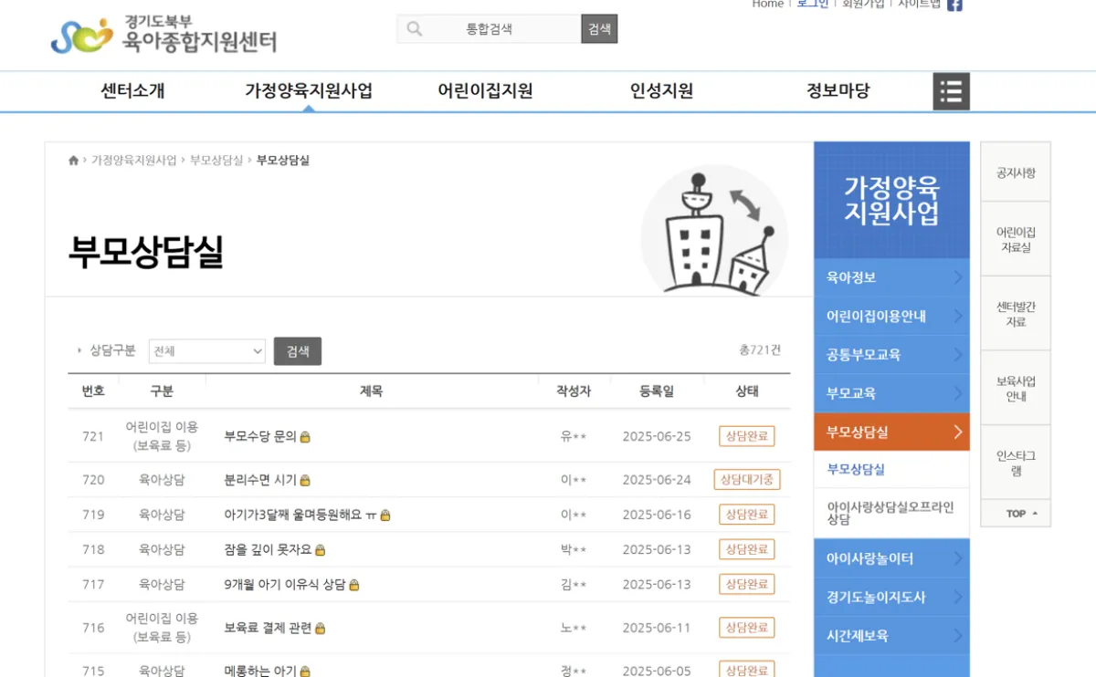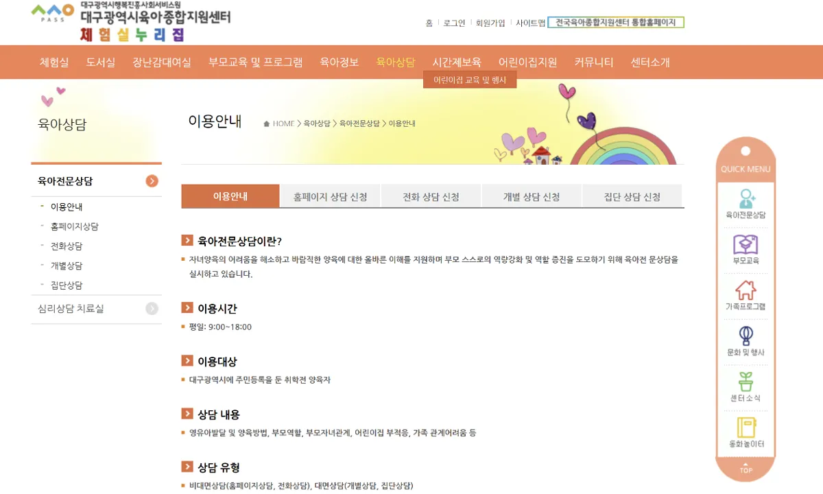 이 외에도 방문상담이 부담스러우시면 홈페이지 상 부모상담실에서 비대면 육아상담을 받으실 수 도 있습니다.