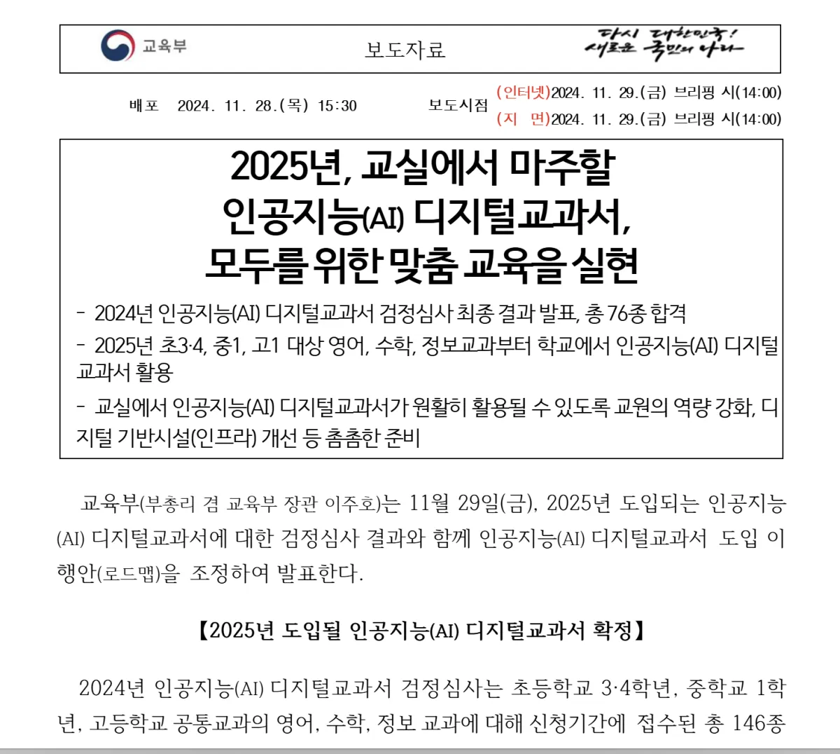 확대 계획: 2028년까지 국어, 기술가정, 사회, 과학으로 단계적 확대