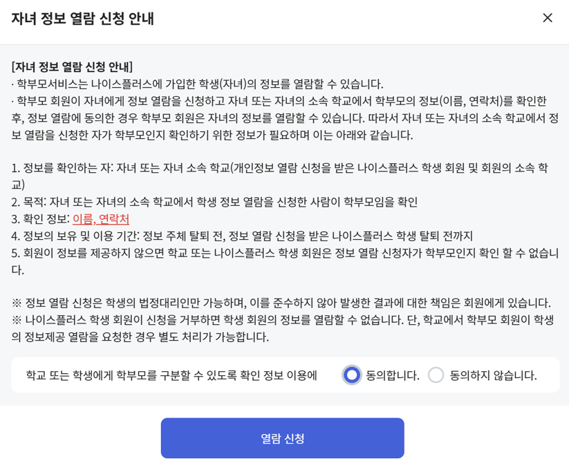 2. 자녀 이름으로 나이스 플러스 가입 후 보호자 승인 (핸드폰, 이메일 인증)해서 자녀등록요청에 동의하면 서비스 연결 완료