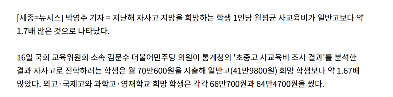 실제로 자사고 진학을 희망하는 학생의 월평균 사교육비는 70만 600원으로, 일반고 희망 학생보다 약 1.7배 많습니다.