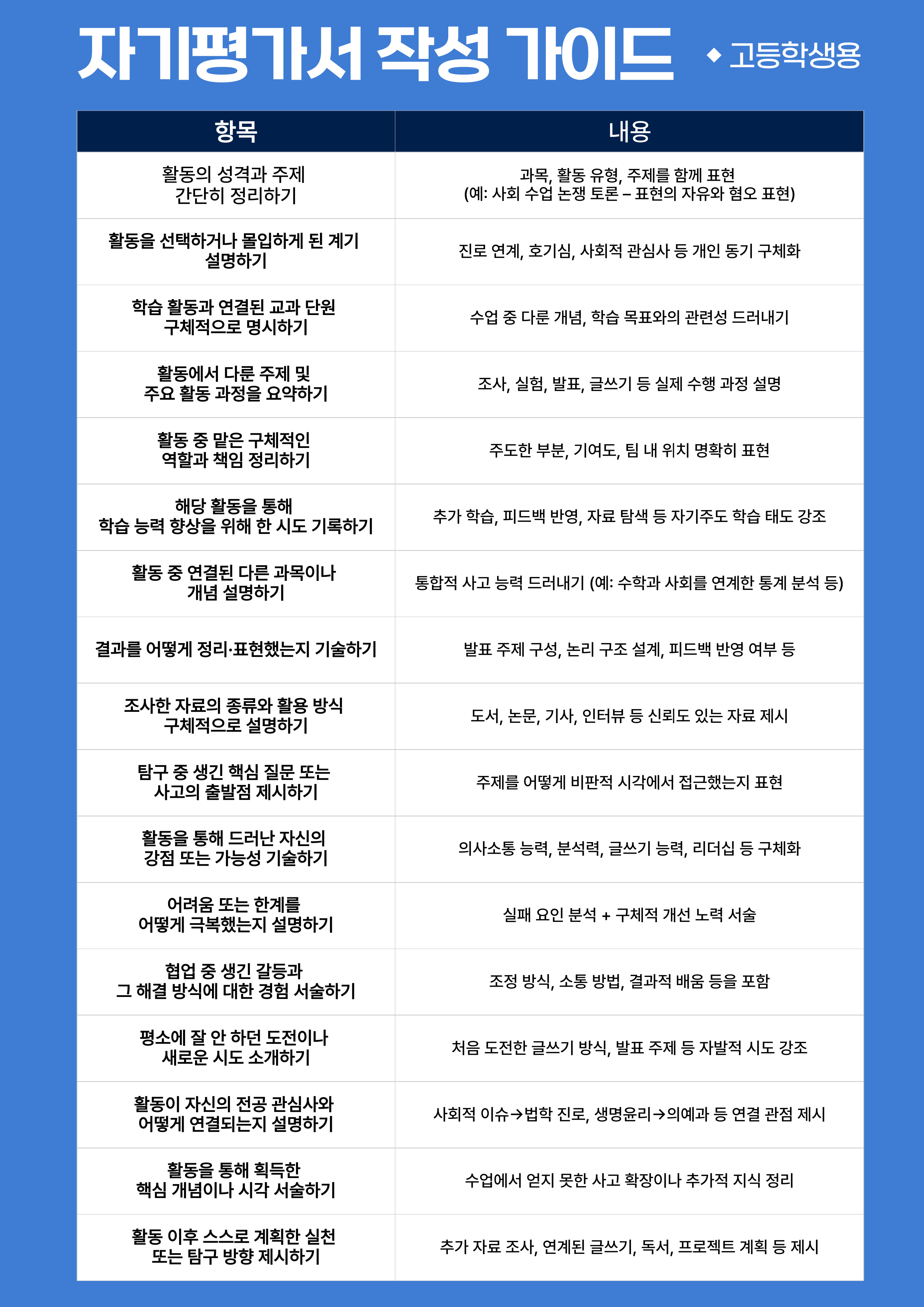 생기부 항목에 반영하기 때문에 어떻게 쓰느냐에 따라 생활기록부의 깊이와 질이 크게 달라질 수있습니다.