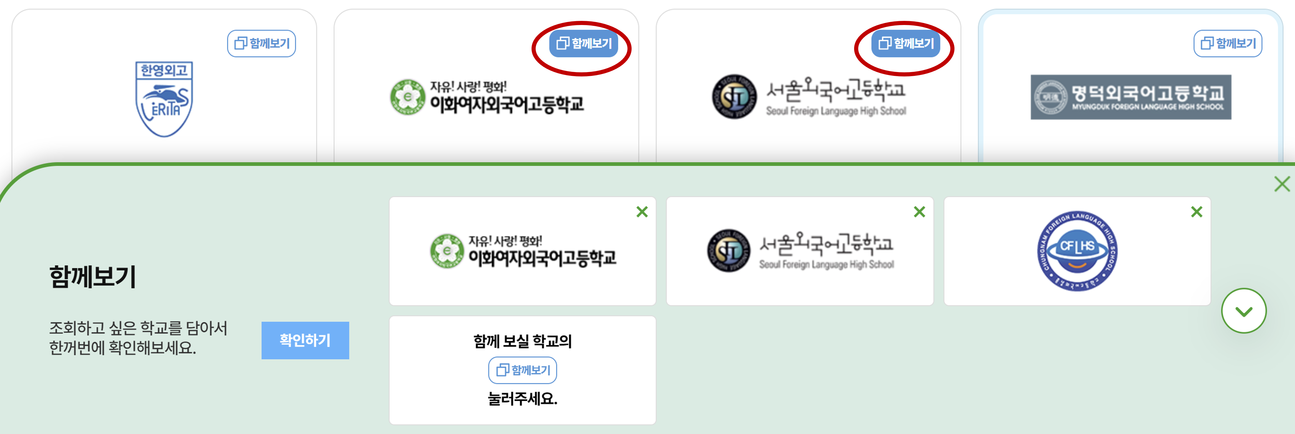 또는 학교들 중에서 관심있는 학교 선택>학교명 오른쪽 상단 함께보기 선택