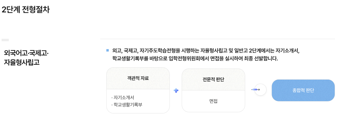 서울 외 자사고 = 1단계 내신성적+출결로 1.5~2배수 선발 후 학생들을 대상으로 면접전형을 시행하여,