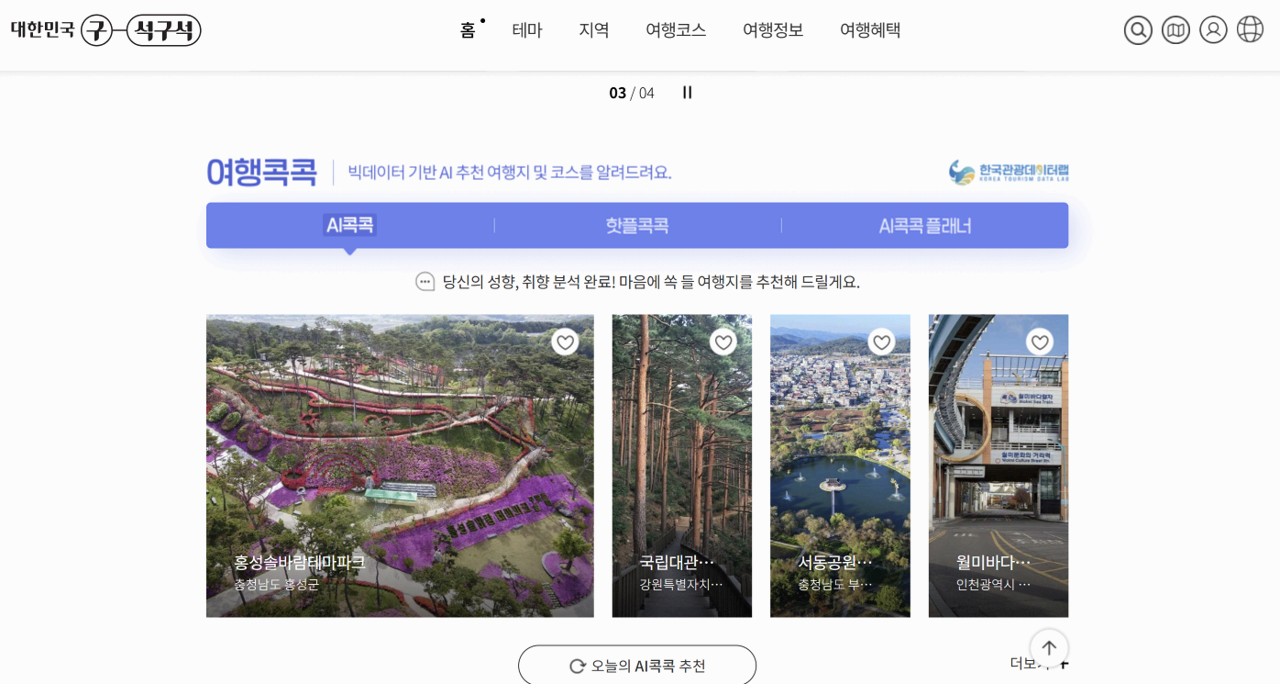 사이트 접속 후 ‘여행지’ 탭에서 지역, 계절, 테마, 키워드 등으로 필터링하면