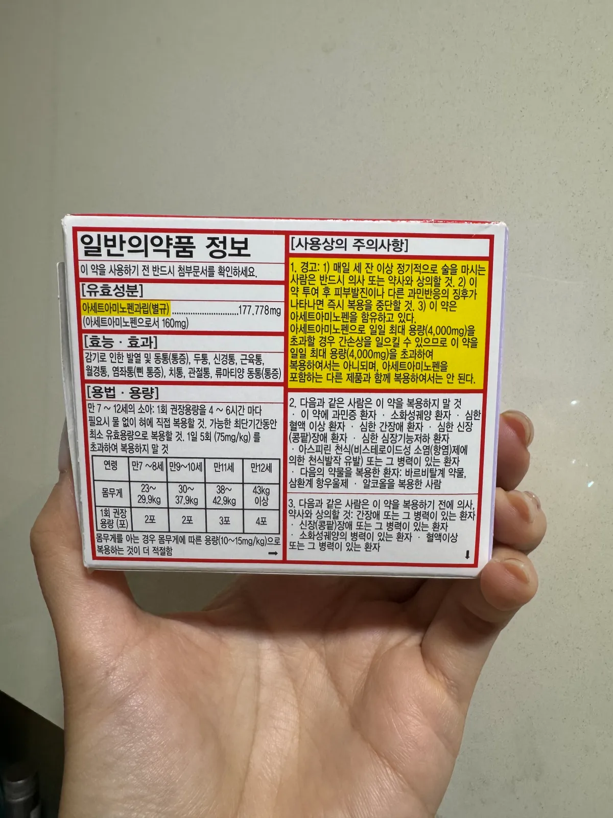 | 7–8세 | 23–29.9kg | 320mg (2포) | 4–6시간 간격, 최대 5회/일 |